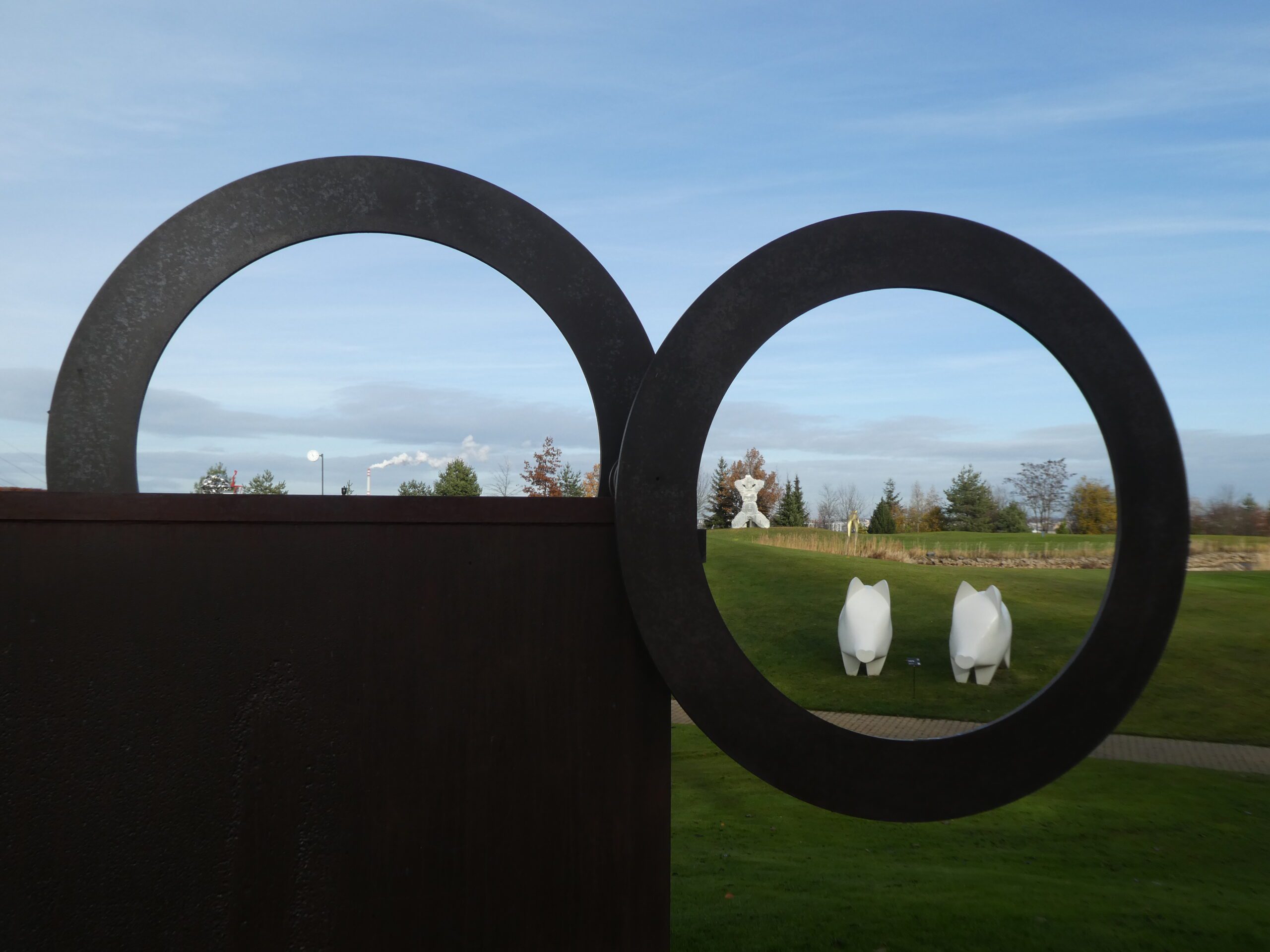 Instalace, kterou můžete sami rozpohybovat, no není to nádhera? Stačí jen lehce zabrat rukou, a kovové kruhy na této monumentální plastice se vydají na svou planetární pouť po hostivařském galerijním vesmíru. Pak už je jen stačí sledovat z různých úhlů a pozorovat, jak se postupně potkávají s dalšími díly v okolí klubovny. A jak dílo charakterizoval sám autor? „Plastika Planety – Kruhy reflektuje Keplerovy zákony pohybu planet jak výtvarně, tak i emocionálním zážitkem. Hmota dvou prstenců se valí po hraně ocelové desky jakoby ve stavu beztíže. V plastice jsou zakódovány i fyzikální jevy setrvačnosti a tření, které v astronomii řešil Isaac Newton. Je tam zašifrována také věta syrakuského matematika a fyzika Archiméda: ‚dejte mi pevný bod ve vesmíru a já pohnu Zeměkoulí…‘, neboť opravdu stačí pomocí páky naklonit rovinu a válec s kruhy (planetami) se rozjede…,“