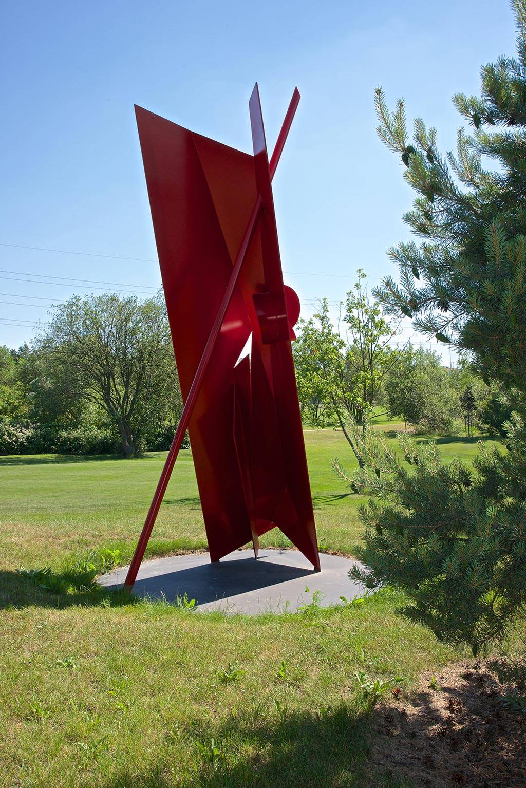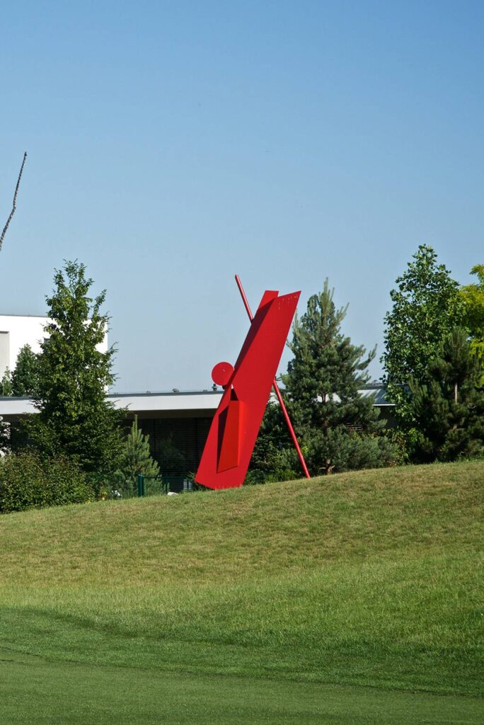 Na hřišti umístěná červená geometrická plastika je dílem z poslední fáze tvorby Karla Malicha. Po řadě let se umělec opět rozhodl překročit hranice dvojrozměrné plochy papíru a vstoupit do trojrozměrného prostoru, což se projevilo ve tvorbě plastik, v nichž reflektuje své celoživotní umělecké zkušenosti. Přestože se jedná o abstraktní konstrukci, lze v ní vycítit jak ozvuky lidské figury, tak určitou vznešenost, která připomíná krajinné útvary.